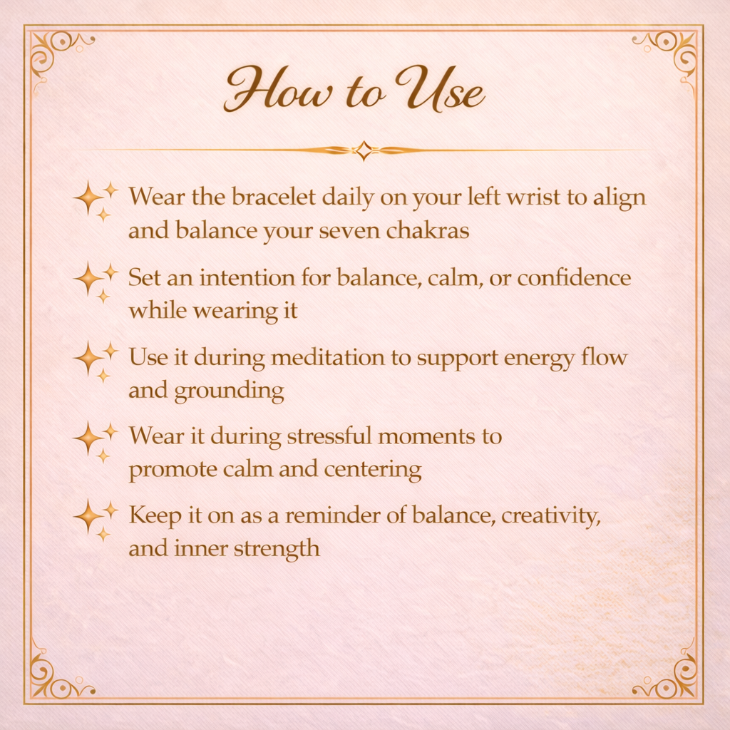 Crafted with seven healing crystals, this bracelet brings together their combined power to bless, balance, and protect you in everyday life. It is believed to reduce mental and physical stress, helping you feel calmer and more centered.