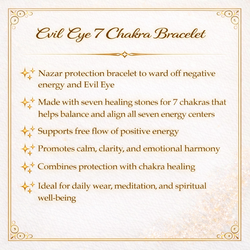 The Evil Eye 7 Chakra Bracelet is a powerful Nazar protection bracelet designed to guard you against negative energies while keeping your seven chakras balanced and aligned.